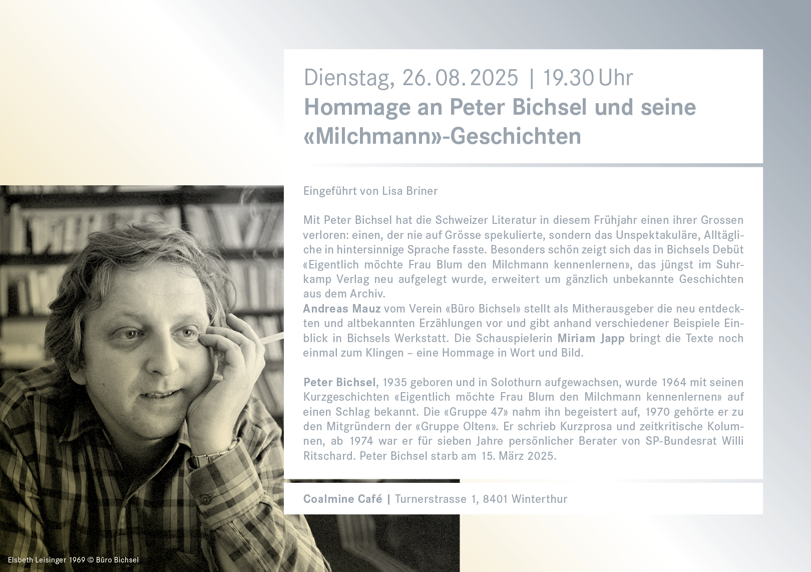 Peter Bichsel, 1935 geboren und in Solothurn aufgewachsen, wurde 1964 mit seinen Kurzgeschichten «Eigentlich möchte Frau Blum den Milchmann kennenlernen» auf einen Schlag bekannt. Die «Gruppe 47» nahm ihn begeistert auf, 1970 gehörte er zu den Mitgründern der «Gruppe Olten». Er schrieb Kurzprosa und zeitkritische Kolumnen, ab 1974 war er für sieben Jahre persönlicher Berater von SP-Bundesrat Willi Ritschard. Peter Bichsel starb am 15. März 2025.